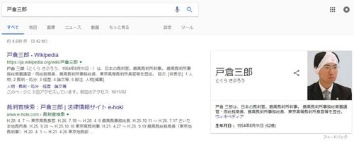つい最近,新しい最高裁判事に戸倉三郎元東京高裁長官が任命された。 裁判所|戸倉三郎 ここで,グーグルで「戸倉三郎」を検索すると,下記の検索結果が表示される(今日撮ったスクリーンショット)。 どうもグーグルは戸倉三郎裁判官をパンツを被った男性と…